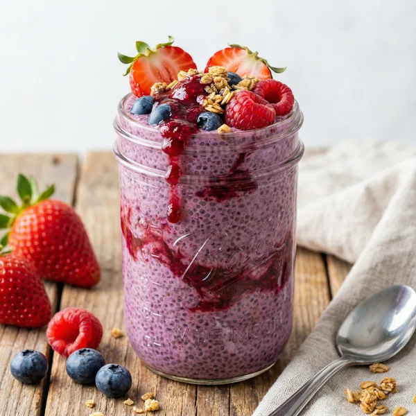 This colorful and antioxidant-rich mixed berry chia pudding boasts an impressive 18g of plant-based protein per serving, making it an ideal choice for fueling your active lifestyle. The creamy, velvety texture is perfectly complemented by bursts of juicy berries, offering a delightful balance of sweetness and tartness with every spoonful. Rich in fiber, healthy fats, and antioxidants, this pudding not only satisfies your taste buds but also supports digestion and immune health. Its smooth consistency makes it a fantastic post-workout recovery treat or a nutritious breakfast to start your day energized. Thanks to its vegan-friendly ingredients, it’s suitable for a variety of dietary preferences and can easily be made gluten-free—just ensure your oats or add-ins are certified gluten-free. For best results, prepare it the night before to allow the chia seeds to fully hydrate and develop a pudding-like texture, and customize it with your favorite toppings like nuts or extra berries for added crunch. Whether enjoyed straight from the fridge or topped with a sprinkle of granola, this versatile dish is both nourishing and irresistibly delicious—perfect for meal prep or a quick snack on busy mornings. All nutrition data is verified using USDA FoodData Central for accuracy.
